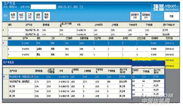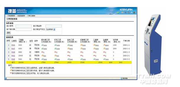 (2)客戶自助終端——在樣品陳列室或客戶接待室,設置客戶自助查詢終端;或者在企業(yè)網(wǎng)站上開設查詢頁面,客戶可以通過自助查詢終端或互聯(lián)網(wǎng)查詢自己訂單的實時生產(chǎn)進度、查看成品的驗布報告、查看歷史訂單等。