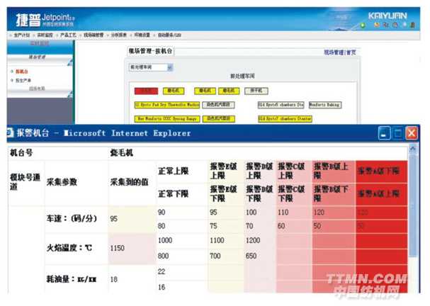 當機臺異常運轉(zhuǎn)、工藝參數(shù)超過正常范圍時,系統(tǒng)將立即反應,通過聲光報警裝置提醒現(xiàn)場操作人員及時進行調(diào)整,同時通過網(wǎng)絡將異常情況發(fā)生的機臺和參數(shù),通報生產(chǎn)管理人員。