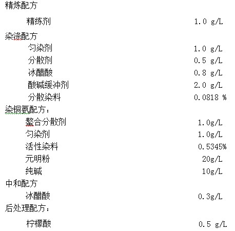 染銅氨纖維:60℃×30min,銅氨纖維與黏膠纖維性質(zhì)類(lèi)似,上染速率快,因此采用三次加鹽三次加堿工藝。