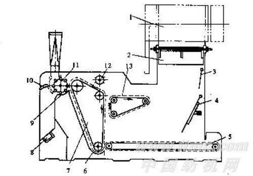 A006B、C型自動混棉機(jī)結(jié)構(gòu)如圖2-3-4所示,原料通過其上凝棉器1吸入本機(jī),在擺斗2上金屬翼片的作用下,將棉塊橫向鋪放在水平輸棉簾5上,成為多層橫鋪的混和棉堆。搖柵3(或光電管)控制棉箱棉量高度,當(dāng)高度達(dá)到要求時,控制抓棉小車仃車,低于要求高度時,控制抓棉小車開始抓棉,使棉箱中的存棉量保持一定穩(wěn)定。在機(jī)身外調(diào)節(jié)混棉比斜板4角度(22.5°~40°)可控制混棉量和混棉效果。壓棉簾13與輸入棉簾5同速,將棉塊夾持并逐漸壓縮送入角釘簾7,角釘簾速度快,角釘針尖向上,而壓棉簾速度慢,針尖向下,于是兩者間對棉塊產(chǎn)生了撕扯開松作用。角釘簾向上帶動棉塊時,又受到均棉羅拉12上角釘?shù)乃撼逗痛驌糇饔茫⒍嘤嗝迚K回?fù)舻綁好藓熒希匦逻M(jìn)入棉箱混和。角釘簾上棉塊運(yùn)行到剝棉打手11位置時,棉塊受打手作用被剝下,擊到塵格9上,部分大雜被拋出。被撕扯打擊后的小棉塊受前方機(jī)臺凝棉器上風(fēng)機(jī)的作用,經(jīng)磁鐵裝置8除去部分鐵雜后到前方機(jī)臺,或根據(jù)工藝要求,利用間道隔板10從上出口輸送到前方機(jī)臺。A006C型自動混棉機(jī)用于紡化纖,只有上出口。