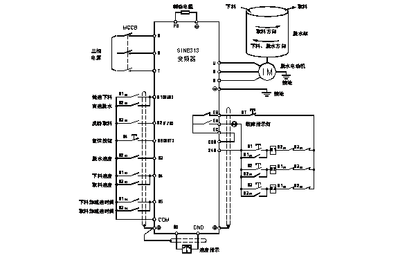 控制回路輸入端子中,RUN端子為正轉(zhuǎn)運(yùn)行端子,F(xiàn)/R端子為反轉(zhuǎn)運(yùn)行端子,X3端子定義為多段速1(正常脫水速度),X4端子定義為多段速2(下料、取料速度),X5端子定義為加減速時(shí)間2(下料、取料加減速時(shí)間),X6端子定義為故障復(fù)位端子。EA、EB、EC為變頻器故障輸出繼電器觸點(diǎn)。