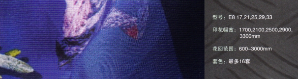 E8機(jī)型是基于1944年世界上第一臺平網(wǎng)印花機(jī)研發(fā)出來的。這兩個姊妹型號都是有兩個伺服電機(jī)同步驅(qū)動的。E8的主要特點(diǎn)是外觀時尚美觀,臺板長達(dá)32米,套色可以達(dá)到16套。
