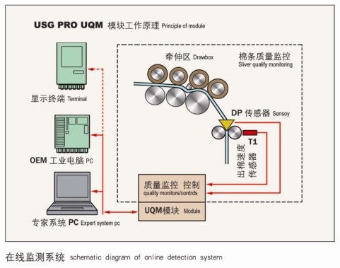 在線檢測(cè)功能(選用):本機(jī)可選用USTER? SLIVERGUARD PRO/第二代在線棉條質(zhì)量管理系統(tǒng)。該系統(tǒng)可隨機(jī)統(tǒng)計(jì)1m,3m,10m的重量不勻率,及CV%,A%等,可隨時(shí)查看和記錄波譜圖,根據(jù)用戶需要選擇超標(biāo)自停或者超標(biāo)報(bào)警,并顯示停車原因或報(bào)警原因,從而有利于質(zhì)量控制與分析,減少試驗(yàn)工勞動(dòng)強(qiáng)度。