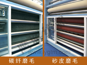 2、砂皮、碳纖六輥組合磨毛,磨輥裝置次序可以任意互換,以滿足不同織物和不同的效果。