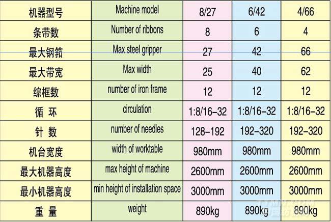 用 途:用于生產(chǎn)圖案,字符,文字等經(jīng)提花效果的彈性或非彈性窄幅織物以及裝飾物。花型創(chuàng)建由320根和12片綜框控制。可生產(chǎn)各式彈性帶與非彈性帶類,例如胸圍帶,衣褲松緊帶,緞帶,拉鏈帶,鞋帶等,可廣泛用于成衣,帽子,發(fā)飾,禮品,醫(yī)療用品,皮帶,手套,雨衣,鞋類,照相機,手表,皮包等提花織帶。