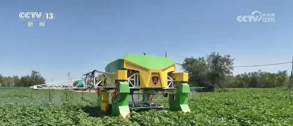 在新疆昌吉州國家級農(nóng)業(yè)高新技術(shù)示范區(qū),這個可以根據(jù)棉花生長高度動態(tài)調(diào)節(jié)和360原地調(diào)頭的機器人正在對棉田進行水肥管理。12米長的機械臂上安裝了31個不同的噴頭,能夠同時向棉株的不同部位噴施水肥。