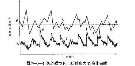 前羅拉到導(dǎo)紗鉤之間的紗段,一般稱紡紗段紗線。紡紗段紗線所具有的強力稱為紡紗強力。在紡紗過程中,如果紗線某截面處強力小于作用在該處的張力時,就發(fā)生斷頭,因此斷頭的根本原因是強力與張力的矛盾。如圖7—5—1所示為實測中號紗紡紗張力Ts和紡紗強力Ps的變化曲線。從圖中曲線可知,紡紗張力平均值Ts比紡紗強力平均值Ps小得多,斷頭機會是很少的。盡管紡紗張力與紡紗強力兩者各自按其本身規(guī)律波動,但大多數(shù)時間內(nèi)并不一定發(fā)生斷頭。當(dāng)某一瞬間,作用在紗線上某點張力大于該點的強力時,即發(fā)生斷頭(如圖中A、B點),這就說明斷頭主要發(fā)生在張力與強力兩者波動中波峰波谷交叉點,而不在于它的平均值大小。生產(chǎn)中平均張力總是比平均強力小,否則就無法進行生產(chǎn)。由于張力和強力存在波動,因此當(dāng)紗線平均張力增加和平均強力降低,兩者數(shù)值靠近時,就會增加波峰波谷交叉機率,斷頭率也增加。如果張力、強力波動范圍小,特別是降低張力較高的波峰值或提高強力較低的波谷值,兩者的平均值即使靠近些,斷頭仍可穩(wěn)定,甚至有可能減少。所以降低斷頭率的主攻方向是控制和穩(wěn)定張力,提高紡紗強力、降低強力不勻率,尤其是減少突變張力和強力薄弱環(huán)節(jié),以減少張力與強力波峰波谷交叉機率。
