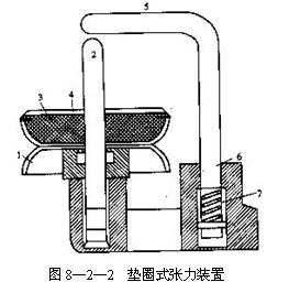墊圈式張力裝置如圖8—2—2所示,由兩片圓盤(pán)形張力盤(pán)1和芯軸2所組成,在上張力盤(pán)內(nèi)裝有毛氈墊圈3和張力墊圈4。紗線在上下兩片張力盤(pán)之間通過(guò)時(shí),由于張力盤(pán)與紗線的摩擦作用,上張力盤(pán)及張力墊圈隨著紗線的前進(jìn)而回轉(zhuǎn),紗線上落下的塵屑被拋出,同時(shí)由于摩擦阻力而使紗線具有一定的張力。毛氈墊圈的作用是吸收上張力盤(pán)和張力墊圈在高速轉(zhuǎn)動(dòng)時(shí)的震動(dòng),使紗線張力均勻,從而得到良好的成形。
