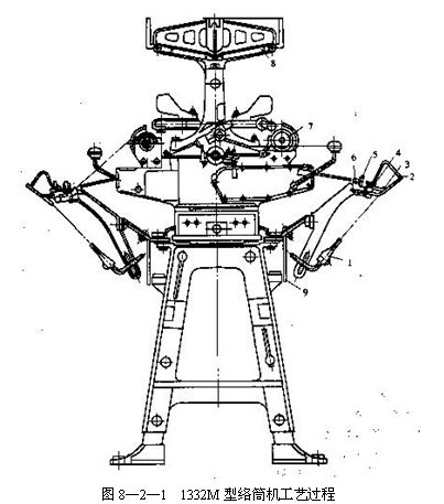 1332型槽筒式絡(luò)筒機(jī)的工藝過(guò)程如圖8—2—1所示。紗線自管紗(線)1退繞下來(lái),經(jīng)導(dǎo)紗桿2引入導(dǎo)紗板凳,再經(jīng)過(guò)圓盤(pán)張力器和清紗板5的縫隙以及張力桿6引入槽筒7的溝槽。由于槽筒摩擦傳動(dòng)筒子回轉(zhuǎn)和溝槽的往復(fù)導(dǎo)紗運(yùn)動(dòng),從而使紗線交叉地卷繞在筒子上。