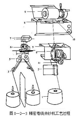 (一).精密卷繞并紗機(jī)的工藝流程  圖8—2—3為精密卷繞并紗機(jī)工藝過(guò)程,喂人單紗筒子1放在擱架上,在紗筒之間有隔紗器。紗線由筒子退繞后,經(jīng)過(guò)氣圈控制器2、導(dǎo)紗器3,穿過(guò)機(jī)械式預(yù)清紗器4、紗線張力裝置6、斷頭探測(cè)器5、切紗與夾紗裝置7,由支撐羅拉10支撐,并由導(dǎo)紗裝置8導(dǎo)向卷繞成精密筒子9。