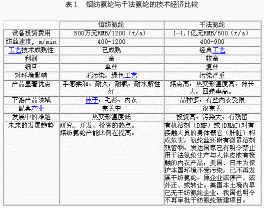 熔融氨綸因工藝流程簡單、設備投資低、生產效率高、紡速快并易于實現氨綸的細旦化等優點深受用戶歡迎,熔融氨綸生產中不需溶劑、無任何排放物和殘留物,環保安全,在國際上稱之為綠色氨綸,所以,其發展前景被普遍看好。1熔融氨綸的優勢和熔融氨綸生產發展現狀1.1熔融氨綸的優勢熔融氨綸工藝是目前世界氨綸兩大主流工藝方法(干法和熔融法)之一,是近年來發展起來的新技術,它以設備投資少、投產周期短、生產流程簡單、產量高、成本低、尤其是無污染等優勢受到人們的普遍關注,成為各大廠商竟相研究、開發、投資的熱點[1-3]。熔紡氨綸與干法氨綸的技術經濟比較見表1。