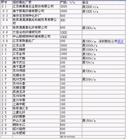 目前,熔紡氨綸在個別性能指標方面還不如干法氨綸,但在中低檔彈性織物的使用領域中完全可取代干法氨綸。由于熔法氨綸生產設備投資少、成本低、紡速高、無污染、能耗低等優點極具競爭力,在短期內還將得到較大發展。1.2我國熔融氨綸生產現狀我國熔紡氨綸產能比例在提高,2003-2004年期間,我國熔融紡絲氨綸纖維生產廠家只有8家,如江蘇南黃海實業股份有限公司(2000t/a)、海寧新高纖維有限公司(1000t/a)、海安宏發特種化纖廠(500t/a)、張家港昌源氨綸機械貿易有限公司(300t/a)、張家港惠泰化纖有限公司(100t/a)、大連合成纖維研究所(1000t/a)、中山新順特種纖維有限公司(1000t/a)、江蘇常熟氨綸廠(深圳新綸公司自行設計研制,100t/a)等,生產能力僅達6000t/a。目前,我國熔融紡絲氨綸纖維生產廠家已發展為30家,生產能力達20200t/a。我國熔紡氨綸廠家生產能力情況見表2。表2 我國熔紡氨綸廠家生產能力