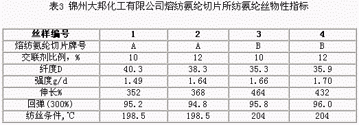 ,制造商Hyperlast)的條件下均可正連續紡絲,所紡得的氨綸絲經大連市化學分析中心檢測合格,大連合成纖維研究所認為:錦州大邦化工有限公司熔紡氨綸切片A、B兩個牌號產品性能穩定,具有比較優良的可紡性。錦州大邦化工有限公司熔紡氨綸切片A、B兩個牌號產品所紡氨綸絲物性指標見表3。