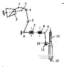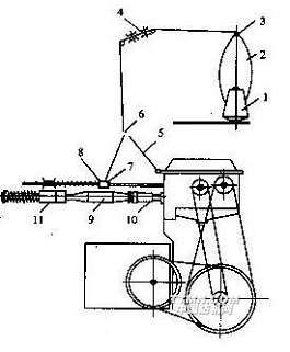 7-導(dǎo)紗器8-導(dǎo)紗鉤9-紆管10-主動(dòng)錠桿11-被動(dòng)錠桿