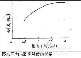 隨著壓燙壓力增加,粘合剝離強(qiáng)度也相應(yīng)提高。但其影響不如溫度的影響明顯,并且壓力達(dá)到一定值后對(duì)剝離強(qiáng)度不再有影響。壓力與剝離強(qiáng)度的關(guān)系如圖6所示。
