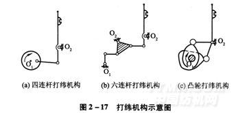 通常打緯機(jī)構(gòu)有四連桿打緯,六連桿打緯和共軛凸輪打緯三種類型,圖2一17為三種機(jī)構(gòu)的示意圖。