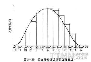 四連桿打緯機(jī)構(gòu)的優(yōu)點(diǎn)是結(jié)構(gòu)簡單,高速運(yùn)轉(zhuǎn)時(shí)運(yùn)動較平穩(wěn),振動相對較低。缺點(diǎn)是在后心時(shí)相對靜止時(shí)間短,緯紗飛行時(shí)間要求嚴(yán)格,不利于寬幅織機(jī)高速運(yùn)轉(zhuǎn)。噴氣織機(jī)上采用的四連桿打緯機(jī)構(gòu)多為短牽手形式,它比中、長牽手四連桿打緯機(jī)構(gòu)在后心的相對靜止時(shí)間稍長,更有利于引緯,而在前心時(shí)加速度相對稍高,有利于打緯。四連桿打緯機(jī)構(gòu)以及其打緯運(yùn)動、打緯運(yùn)動的位移曲線分別見圖2—18~圖2—20。