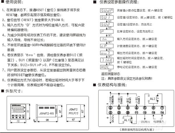 JDM72-6S計數(shù)、計米器以人性化、智能型為設計理念,內(nèi)含微處理器, 計數(shù)/預置數(shù)雙排LED顯示,設計先進、功能強大、抗干擾能力強、計數(shù)精度高、讀數(shù)直觀;并具有以脈沖當量為系數(shù),設定對應計數(shù)值(即長度單位)可對計長精度進行精確修正的先進計長、計數(shù)功能。此外本計數(shù)器還具有下列先進功能: