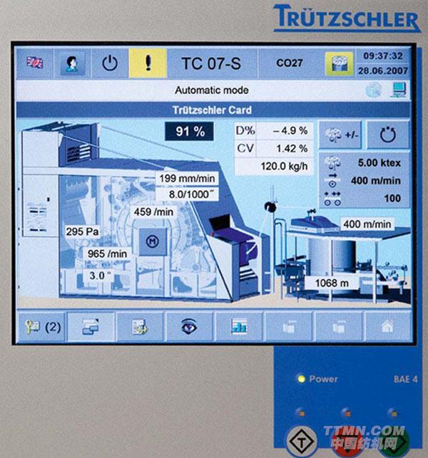 特呂茨勒為其梳棉機(jī)TC7的控制和質(zhì)量數(shù)據(jù)輸入開發(fā)了一套綜合的系統(tǒng)。其核心是一臺(tái)功能強(qiáng)大的工業(yè)計(jì)算機(jī),記錄所有傳感器數(shù)據(jù),并發(fā)送控制命令,包括向驅(qū)動(dòng)和伺服電機(jī)發(fā)送控制命令。大號(hào)彩色觸摸屏是操作者、維護(hù)人員和質(zhì)量主管與計(jì)算機(jī)交流的界面。