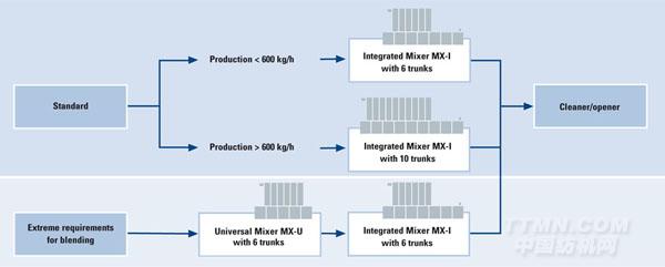特呂茨勒混棉系統(tǒng)可以為每一家紡紗廠的每一項(xiàng)單組分原料混合任務(wù)提供最優(yōu)化的解決方案。其主要優(yōu)點(diǎn)為:
