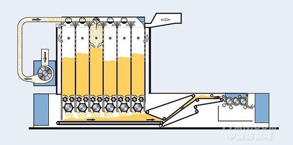 棉箱混棉機(jī)最初用在紡紗廠的前紡工序是為了實(shí)現(xiàn)特定的、可重復(fù)進(jìn)行的原料混合。棉箱同時(shí)被依次填滿和排空,以達(dá)得最佳的混合均勻性。根據(jù)實(shí)際應(yīng)用情況,可選擇6棉箱或10棉箱。如果對(duì)混合的要求還要高,可串連使用兩臺(tái)混棉機(jī)(串連混棉)。