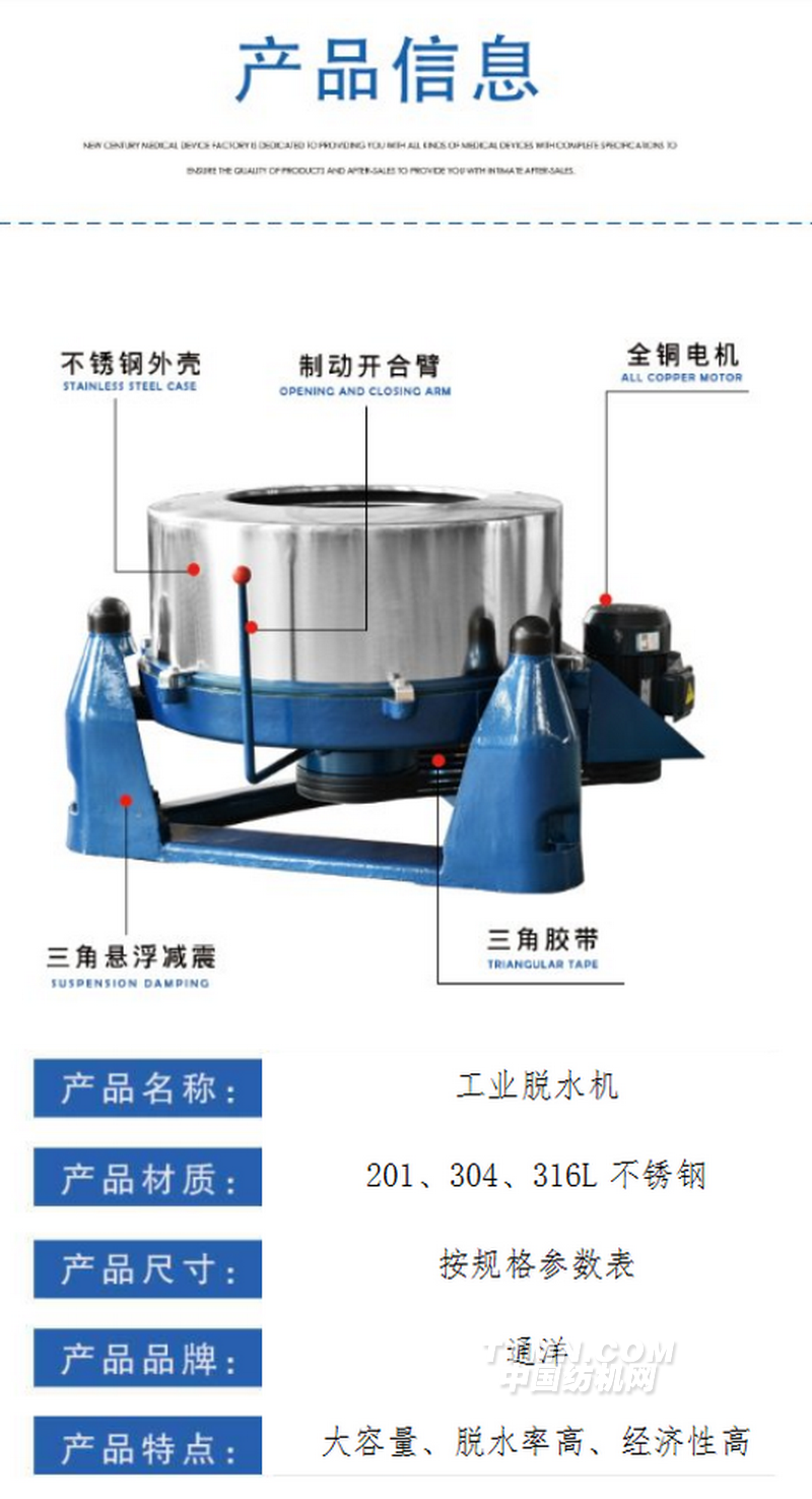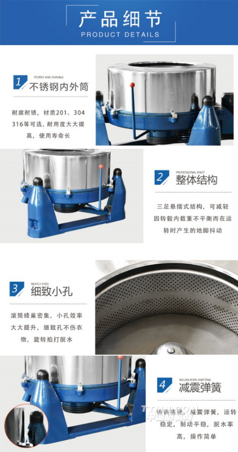 泰州市通江洗滌機(jī)械廠、位于江蘇省泰州市經(jīng)濟(jì)開發(fā)區(qū),是中國(guó)洗滌機(jī)械協(xié)會(huì)會(huì)員單位,是國(guó)內(nèi)生產(chǎn)服裝水洗機(jī)械設(shè)備最大企業(yè)之一,榮獲ISO9001:2000質(zhì)量認(rèn)證、自營(yíng)出口權(quán)。 專業(yè)生產(chǎn):工業(yè)洗滌機(jī)、牛仔噴砂機(jī),牛仔水洗機(jī),絲綢砂洗機(jī),石磨蘭洗滌、砂洗機(jī)、脫水機(jī)、烘干機(jī)、皮革 紋揉機(jī)、干揉機(jī)、水揉機(jī)、洗脫兩用機(jī)、燙平機(jī)、染色機(jī),地毯清洗機(jī),地毯聯(lián)合清洗、烘干一體機(jī)。我廠與日本共同研制的牛仔服洗滌機(jī)、烘干機(jī)具有變頻調(diào)速,氣動(dòng)閉門,氣動(dòng)放水,自動(dòng)控溫等功能,已大批量在國(guó)內(nèi)大型服裝有限公司正常使用, 本廠生產(chǎn)的產(chǎn)品適用于各類服裝廠、水洗廠、醫(yī)院、賓館、皮革廠、乳膠制品廠、大中院校、鐵路列車段等行業(yè),產(chǎn)品性能優(yōu)良,暢銷全國(guó),遠(yuǎn)銷日本及東南亞地區(qū),博得國(guó)內(nèi)外用戶一致好評(píng)。一直以來(lái),我廠堅(jiān)持〃以質(zhì)量求生存、以科技求發(fā)展〃的企業(yè)宗旨,提高關(guān)鍵工序的生產(chǎn)能力,建立現(xiàn)代化的企業(yè)管理制度,拓展市場(chǎng),加強(qiáng)國(guó)內(nèi)國(guó)外銷售網(wǎng)絡(luò)。