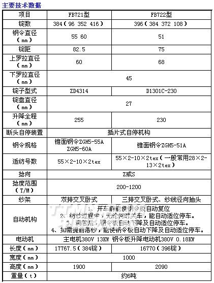 本機(jī)外形簡潔、墻板跨距小、剛性好、結(jié)構(gòu)穩(wěn)定。主電機(jī)安排在車尾,檢修及變換速度方便。錠子傳動采用滾盤及滾動軸承、雙張力盤,適合高速運(yùn)轉(zhuǎn)及捻向變換。車頭傳動采用雙面捻度及適應(yīng)S.Z捻的傳動機(jī)構(gòu)。FB721采用雙排交叉、臥式筒子架,F(xiàn)B722采用三排交叉臥式筒子架,上下左右交叉排列。斷頭自停裝置采用插片式。錠子采用油膜阻尼吸震錠子,對速度適應(yīng)性廣,振動小。鋼令板,導(dǎo)紗板,氣圈環(huán)都采用牽吊式升降。升降系統(tǒng)自動化程度較高,操作簡便。通過輸送帶可將使用過的空筒管輸送到車尾。
